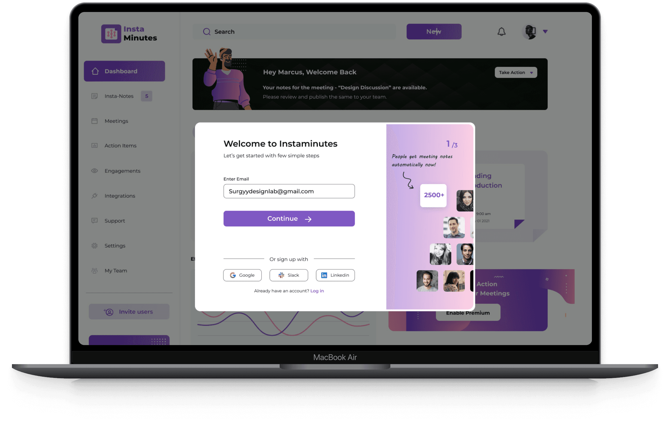 We worked on creating a modern brand identity, a user-friendly dashboard experience, and an intuitive onboarding process. We redesigned the platform’s dashboard to focus entirely on the meeting minutes, tracking productivity and engagement. Additionally, we developed a streamlined landing page to highlight the platform’s key features and benefits, ensuring that users could easily understand and navigate the tool. The ultimate goal was to improve the user experience and drive product-led growth by providing a seamless, efficient meeting management tool.